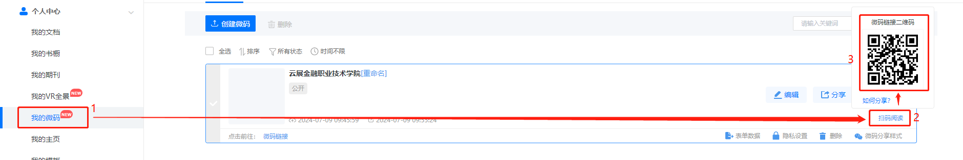 (1)點擊【我的微碼】,將鼠標(biāo)移動到對應(yīng)微碼的【掃碼閱讀】,便會出現(xiàn)二維碼。
