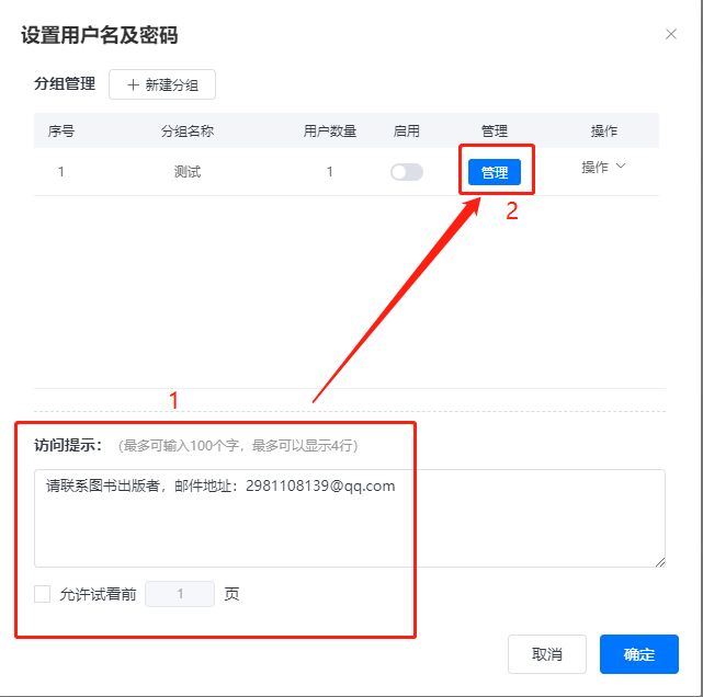 先在下方設(shè)置【訪問提示】以及允許查看前幾頁,然后點擊【管理】。
