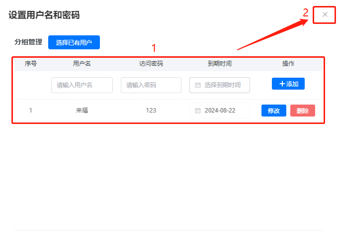 輸入【用戶名】、【密碼】,設(shè)置到期時間,點擊【添加】后,可以在下方看到創(chuàng)建好的用戶名和密碼,然后點擊右上角的【x】關(guān)閉界面。