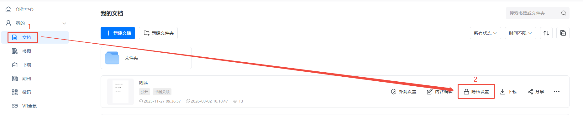 點進(jìn)【文檔】,找到對應(yīng)電子書,然后點擊【隱私設(shè)置】。
