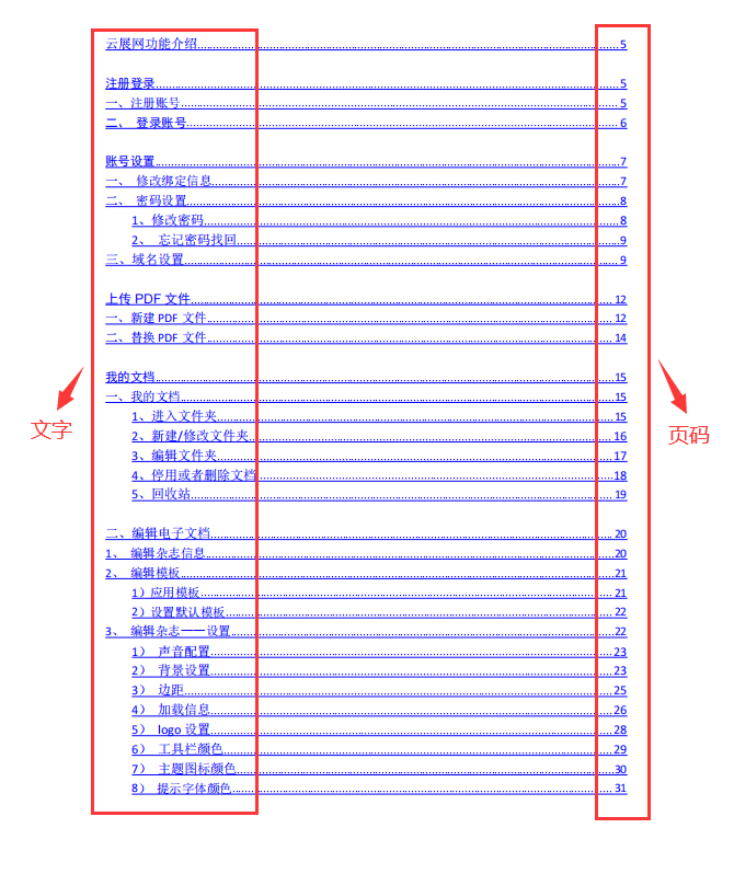 注意:多媒體編輯器里自定義添加的目錄頁暫時(shí)無法識別,必需是上傳pdf制作的電子書,并且pdf上有目錄頁才能識別,目錄必需是文字+頁碼的組合,如下圖: