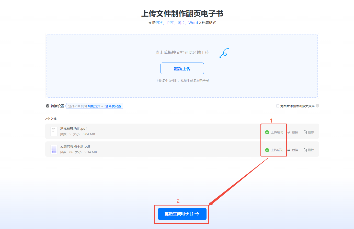 當(dāng)顯示【上傳成功】時(shí),點(diǎn)擊下方【批量生成電子書】,電子書開(kāi)始生成。