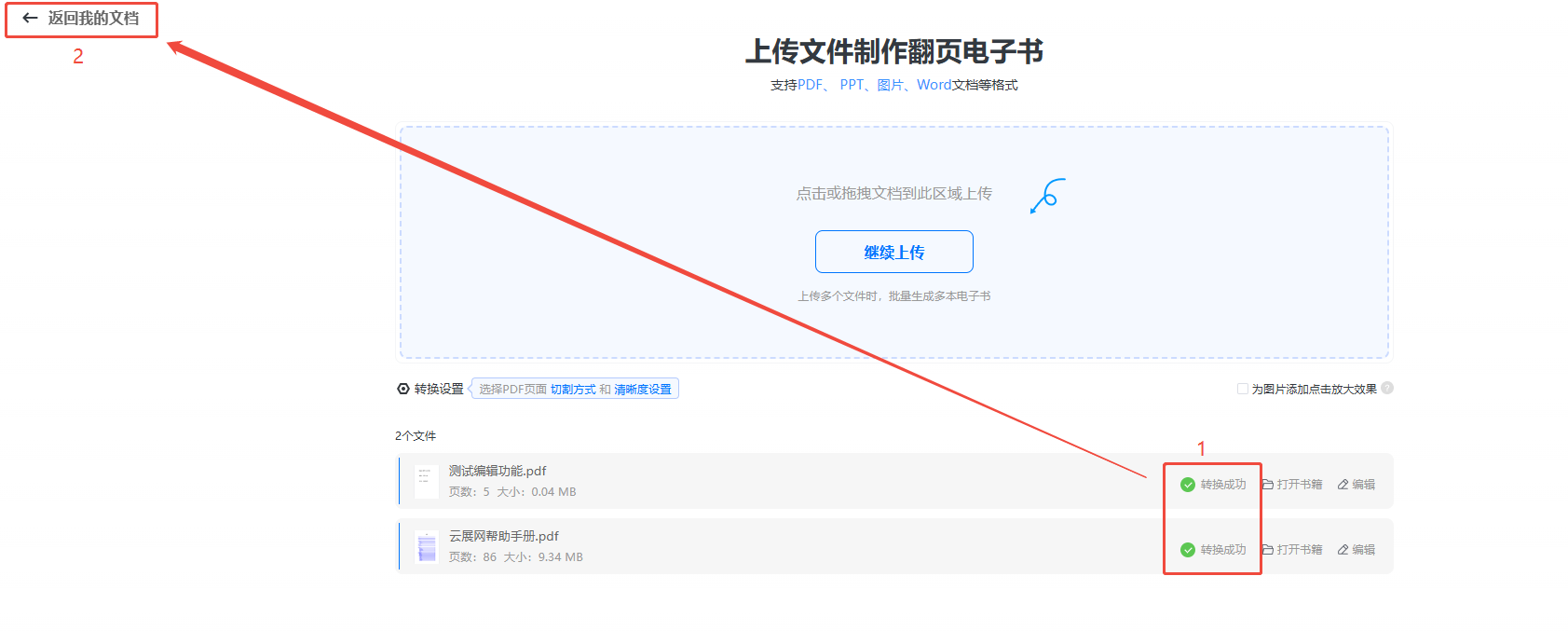 當(dāng)顯示【轉(zhuǎn)換成功】時(shí),就意味著電子畫冊(cè)已經(jīng)生成好了,可點(diǎn)擊左上角【返回我的文檔】查看。
