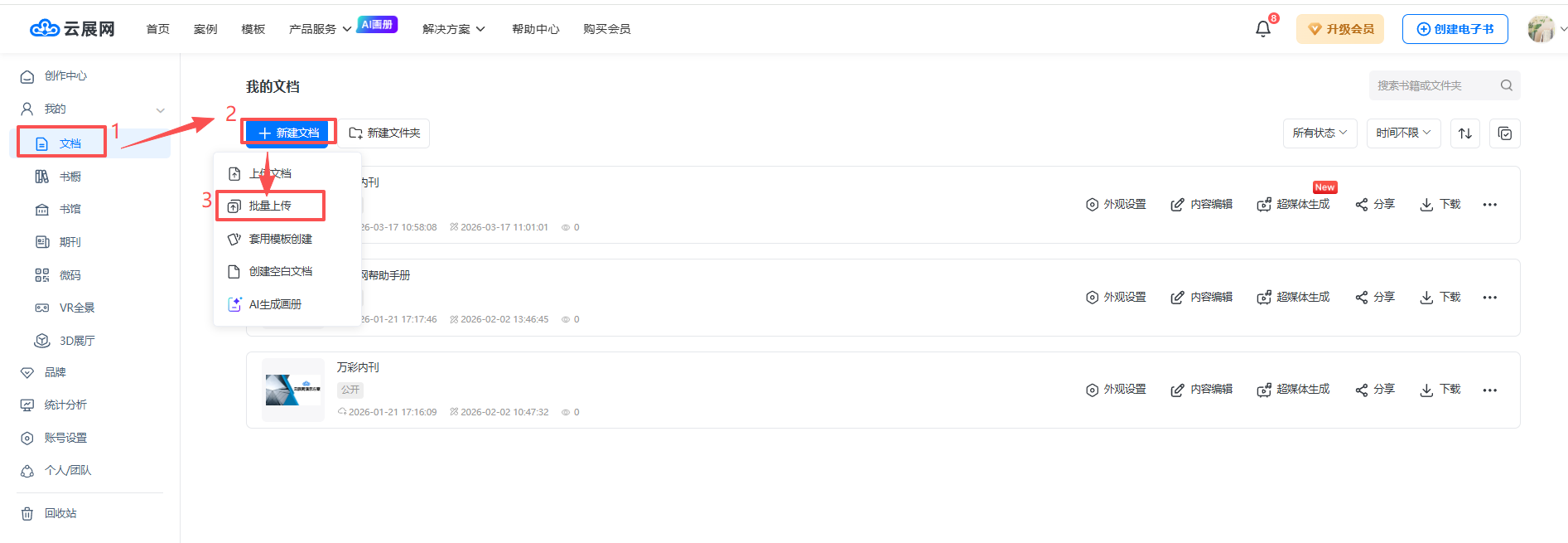 在【文檔】頁(yè)面 ,點(diǎn)擊【新建文檔】,隨后點(diǎn)擊【批量上傳】,打開(kāi)批量上傳界面。
