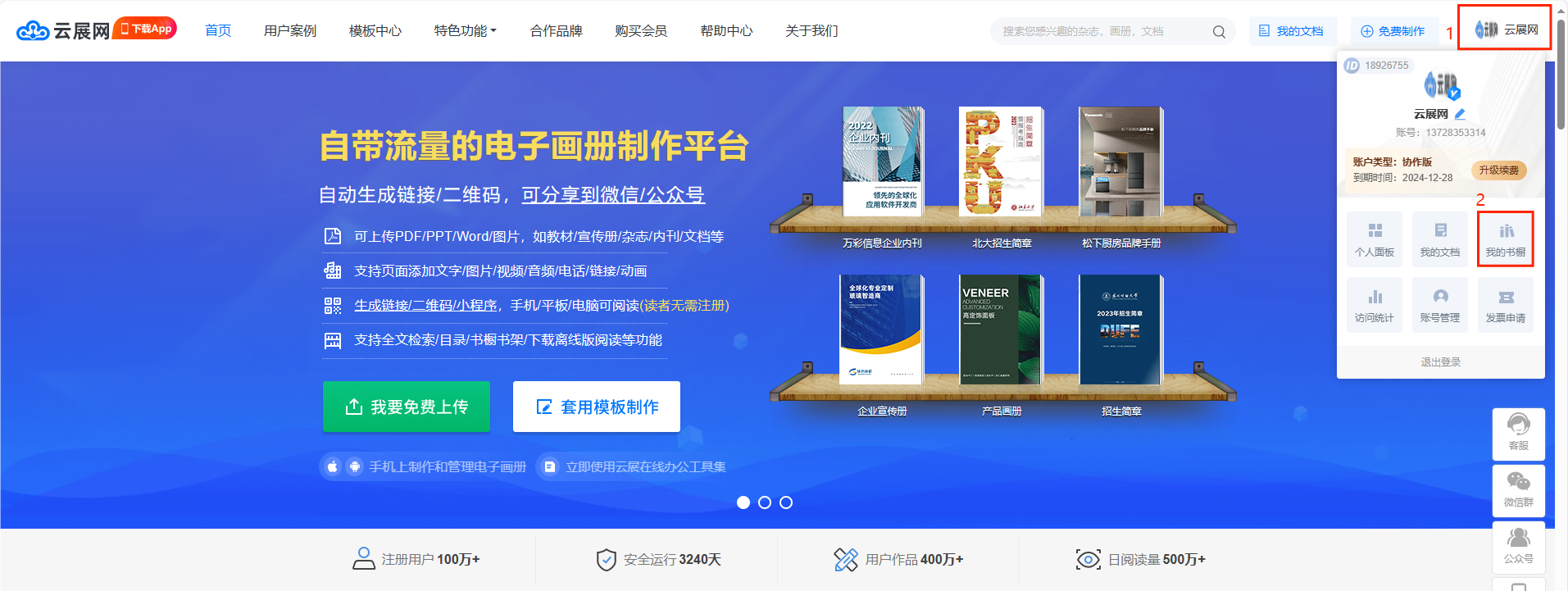 將鼠標(biāo)懸停在云展網(wǎng)首頁右上角我的賬號上,點擊【我的書櫥】進入界面。