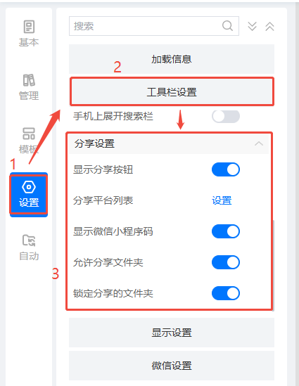 點擊【設(shè)置】中的【工具欄設(shè)置】,下劃找到【分享設(shè)置】,根據(jù)自己的需要進行設(shè)置。