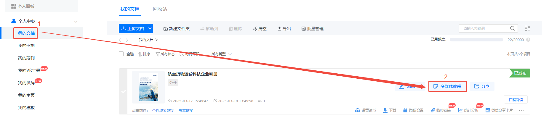 點進【我的文檔】/【文檔】,選擇對應(yīng)電子書,點擊【多媒體編輯】/【內(nèi)容編輯】。
