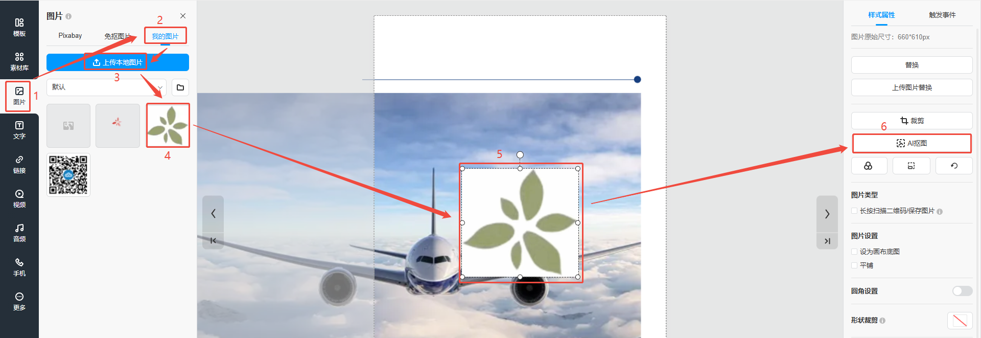 點擊【圖片】,再點擊【我的圖片】,然后點擊【上傳本地圖片】,將圖片上傳到下方素材庫中,點擊素材庫中的圖片,圖片會出現(xiàn)在頁面上,選中頁面上的圖片,最后點擊右側(cè)【AI摳圖】,打開AI摳圖界面。