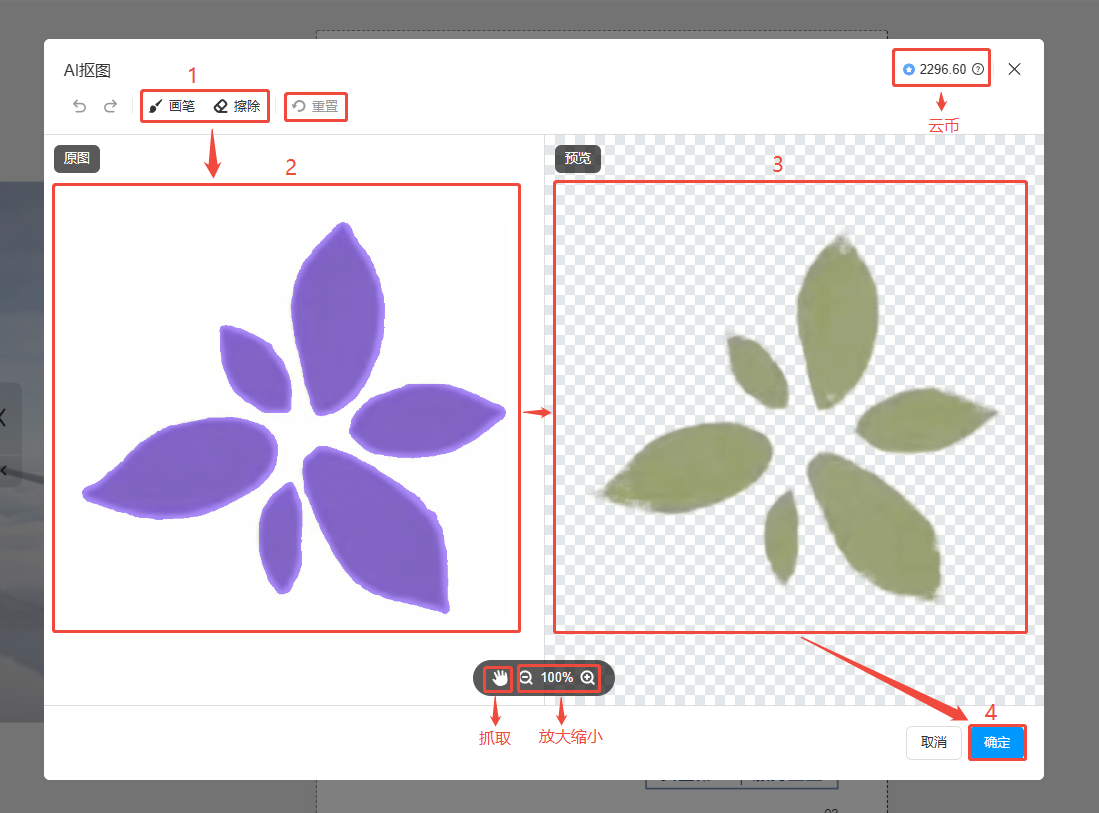 在左側(cè)原圖區(qū)域,紫色部分為摳出來的部分,可以用畫筆涂畫出想要摳出來的部分或者擦除不想摳出來的部分,右側(cè)預(yù)覽區(qū)域查看最終效果,點擊右下角確定。
