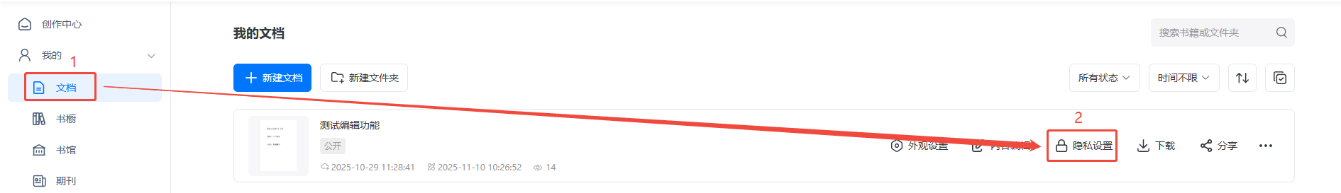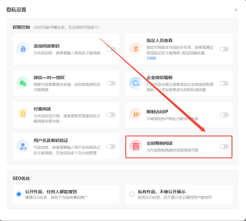 點(diǎn)擊【文檔】,找到電子畫冊再點(diǎn)擊【隱私設(shè)置】,開啟【定時限制閱讀】。