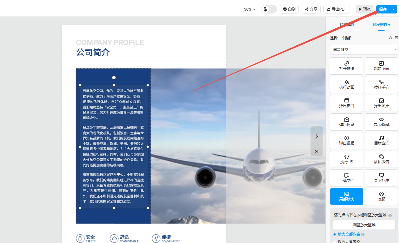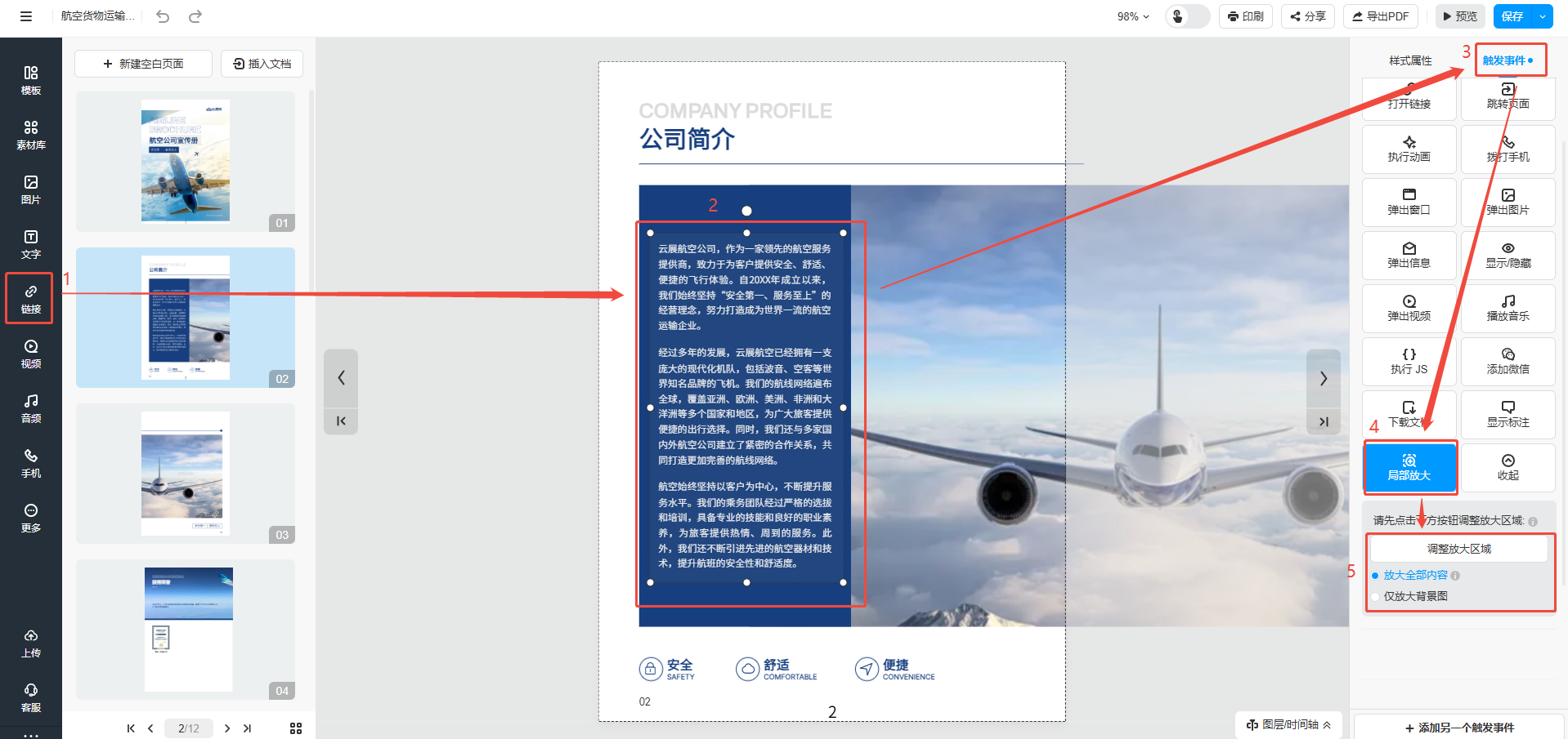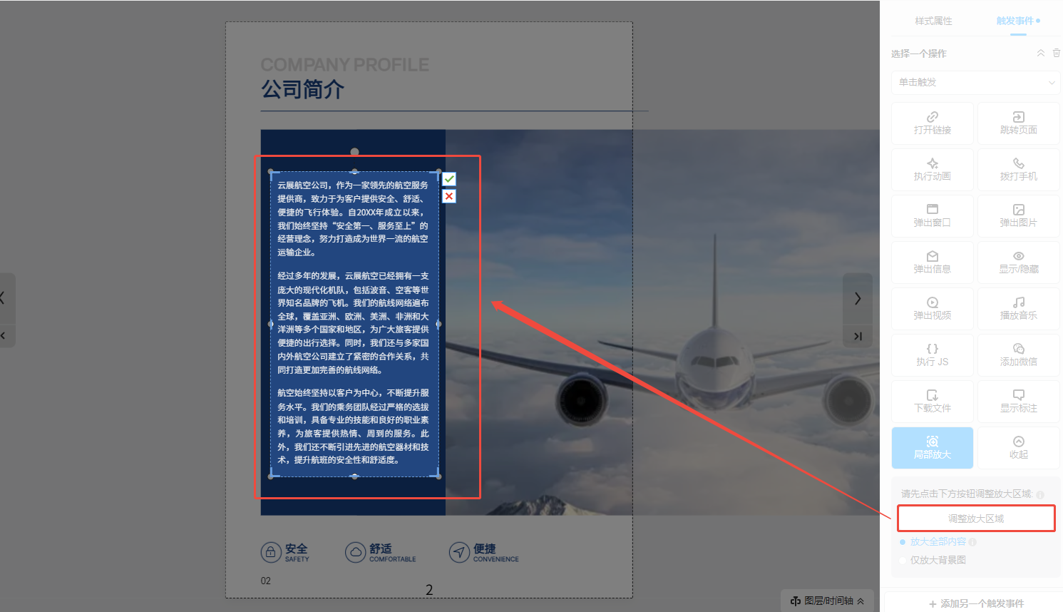 點擊【鏈接】,將鏈接框覆蓋到對應(yīng)的位置,然后點擊【觸發(fā)事件】,選擇【局部放大】,點擊【調(diào)整放大區(qū)域】,選取需要放大的區(qū)域,選取之后選擇放大全部內(nèi)容或者僅放大背景圖。