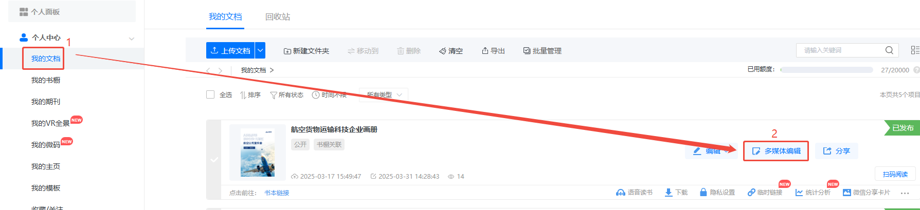 點進(jìn)【我的文檔】/【文檔】,選擇對應(yīng)電子書,點擊【多媒體編輯】/【內(nèi)容編輯】。