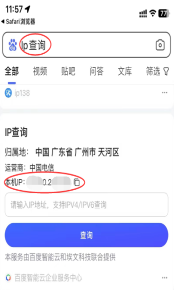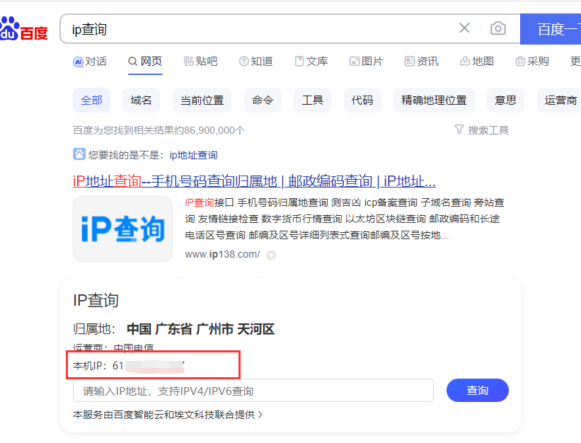 在電腦或者手機的瀏覽器上搜索【IP查詢】就可以獲取當(dāng)前的網(wǎng)絡(luò)IP地址。