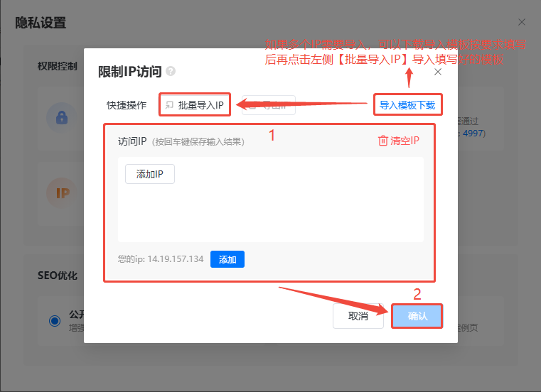 1、如果有多個IP地址需要導(dǎo)入,可以點擊右上角【導(dǎo)入模板下載】,下載導(dǎo)入模板按要求填寫后再點擊左側(cè)【批量導(dǎo)入IP】導(dǎo)入填寫好的模板,再點擊【確認】即可。
