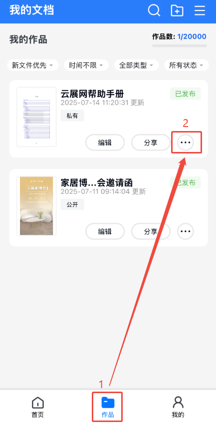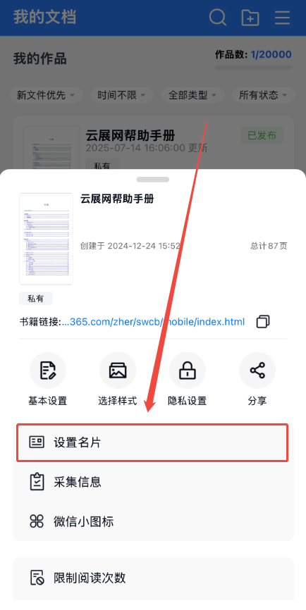 點(diǎn)擊【作品】,點(diǎn)擊對(duì)應(yīng)電子書右邊三個(gè)點(diǎn),然后點(diǎn)擊【設(shè)置名片】打開名片設(shè)置界面。