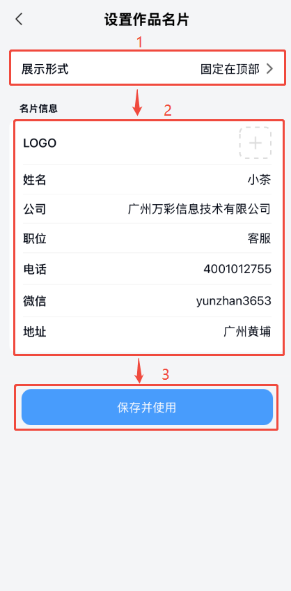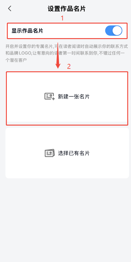 打開【顯示作品名片】,點(diǎn)擊下方【新建一張名片】創(chuàng)建名片,選擇需要的展示形式,完善名片信息后,點(diǎn)擊【保存并使用即可】。