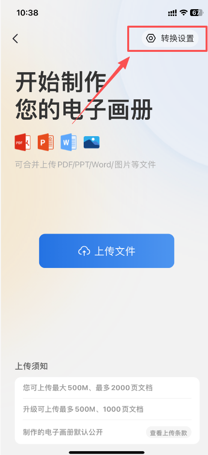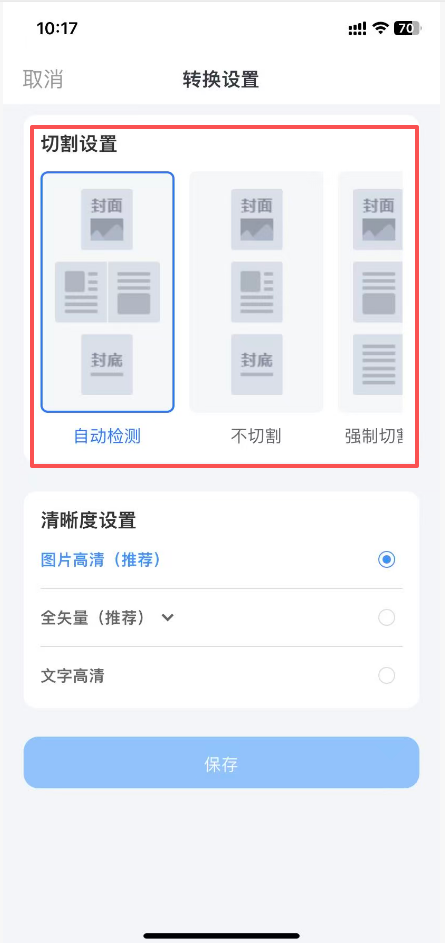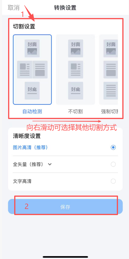 點(diǎn)擊【轉(zhuǎn)換設(shè)置】打開,選擇切割方式后,點(diǎn)擊【保存】,隨后繼續(xù)上傳文檔進(jìn)行制作