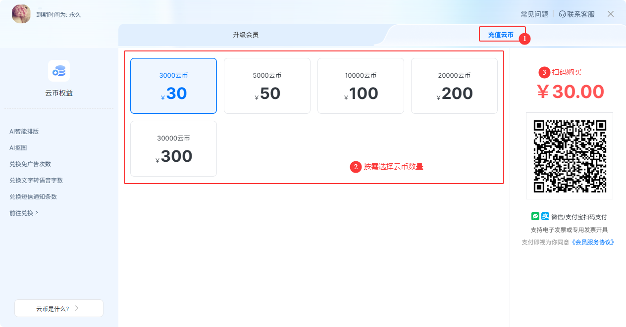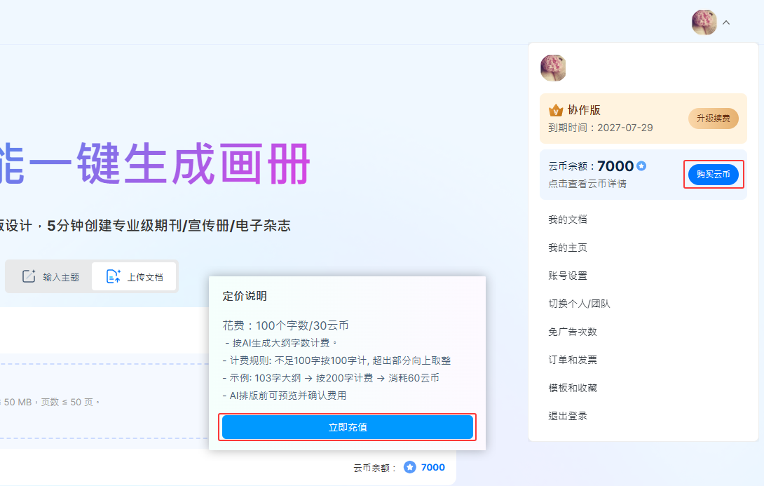 點(diǎn)擊右上角的頭像,或者在【上傳文件】按鈕下方, 鼠標(biāo)懸浮在云幣數(shù)值上,均可查看當(dāng)前賬號(hào)剩余云幣或點(diǎn)擊【購(gòu)買云幣】、【立即充值】,根據(jù)自身需要選擇購(gòu)買更多云幣。