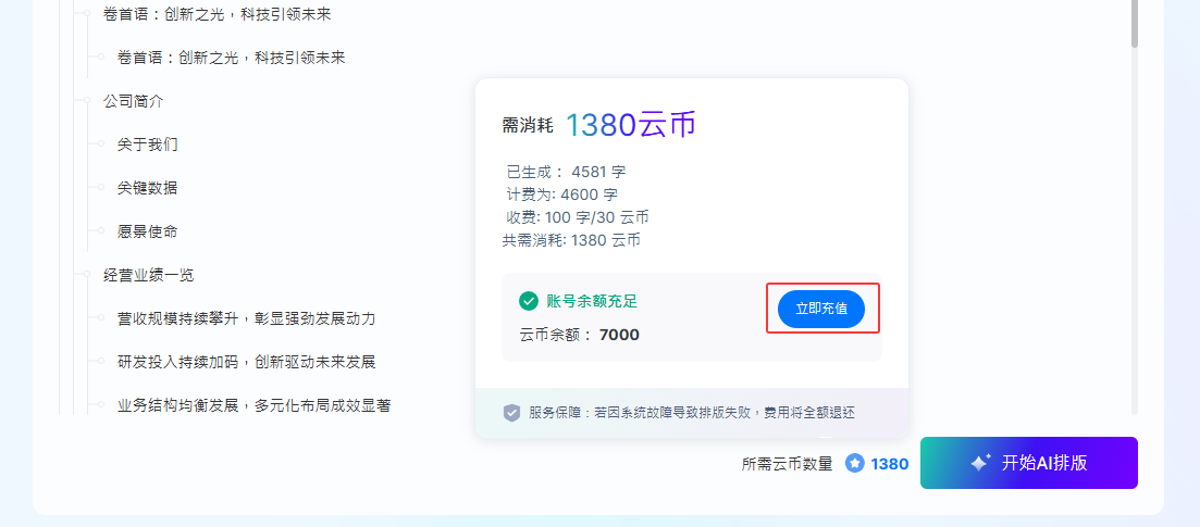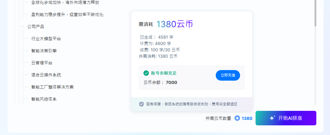 2. 大綱生成完成后,用戶瀏覽確認(rèn)計(jì)費(fèi)明細(xì),點(diǎn)擊【開始AI排版】按鈕,即扣除云幣,此操作不可撤銷。