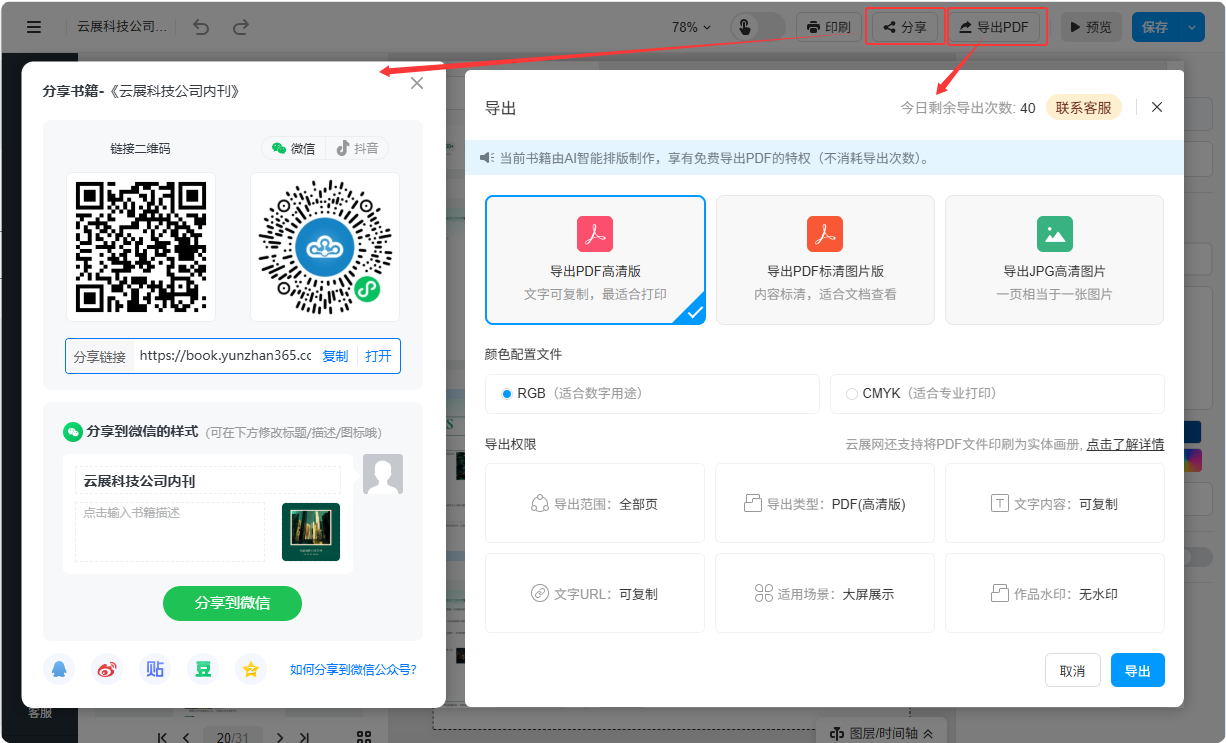 頁面渲染完成后,如需修改內(nèi)容,可直接在多媒體編輯器中進行調(diào)整。制作完成后, 可在線分享書籍或?qū)С龈咔錚DF。