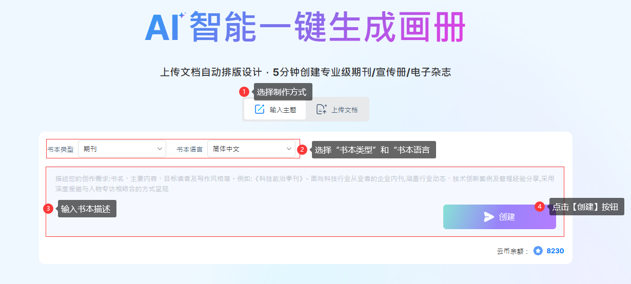 1). 點擊【輸入主題】→ 選擇【書籍類型】→ 選擇【書籍語言】→ 在文本框中輸入主題描述 → 點擊【創(chuàng)建】