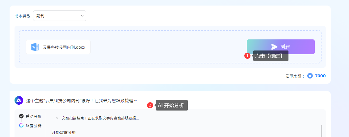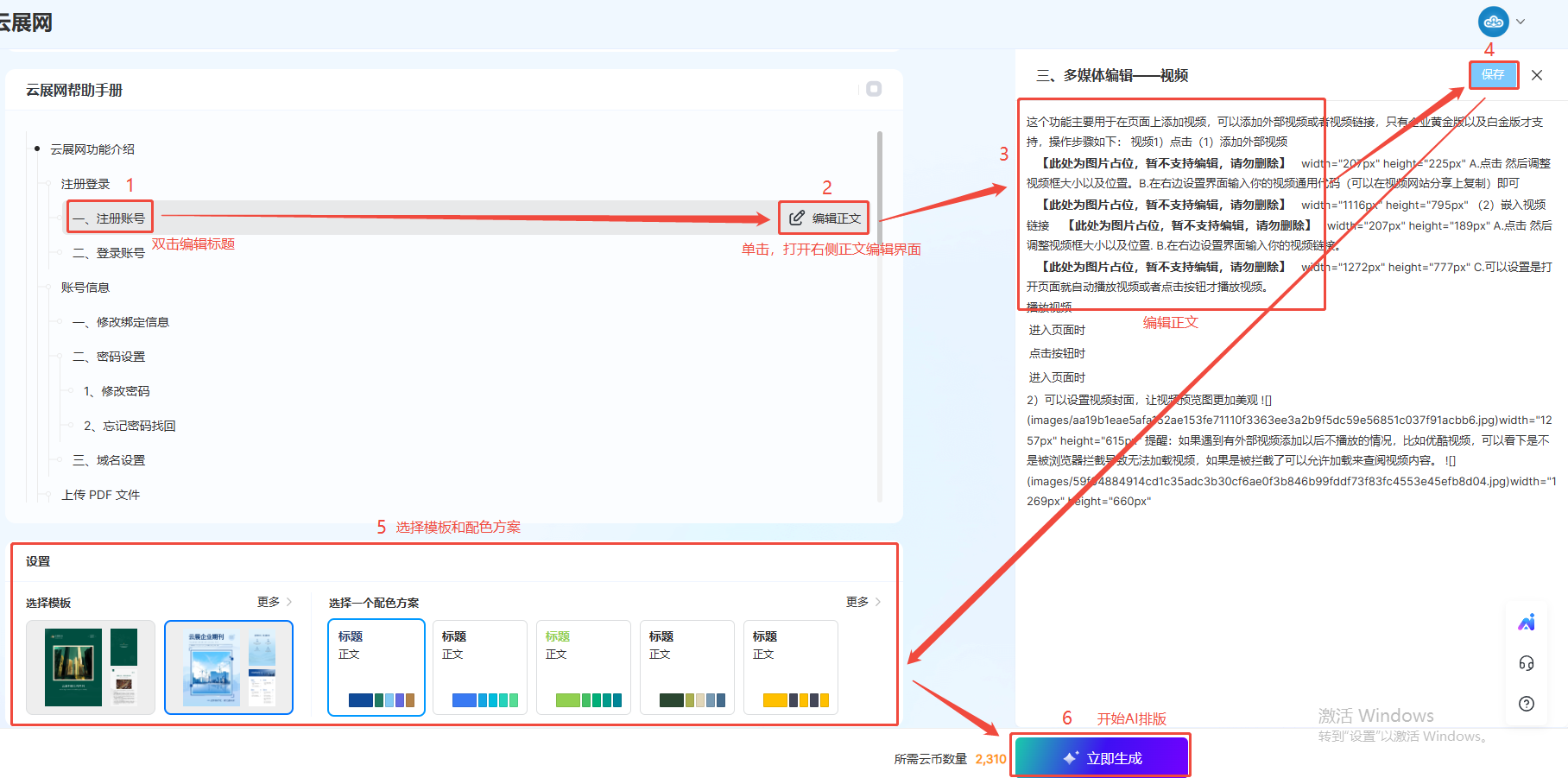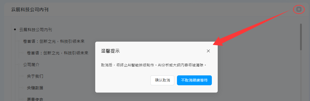 2). 等待AI分析主題并生成大綱 → 編輯大綱標(biāo)題或正文 → 選擇模板和配色方案→預(yù)覽需消耗的云幣→ 點擊【開始AI排版】進入多媒體編輯器排版。