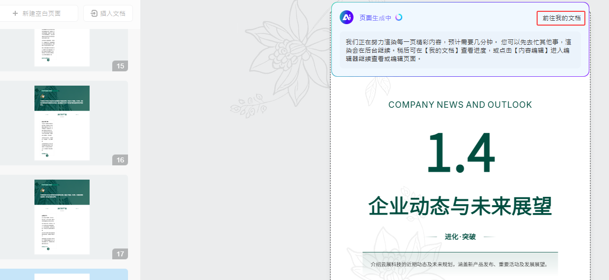 (3)點擊【開始AI排版】后, 即進入多媒體編輯器, AI將會逐一渲染頁面。無需等待生成完成,您可點擊【前往我的文檔】繼續(xù)其他創(chuàng)作。
