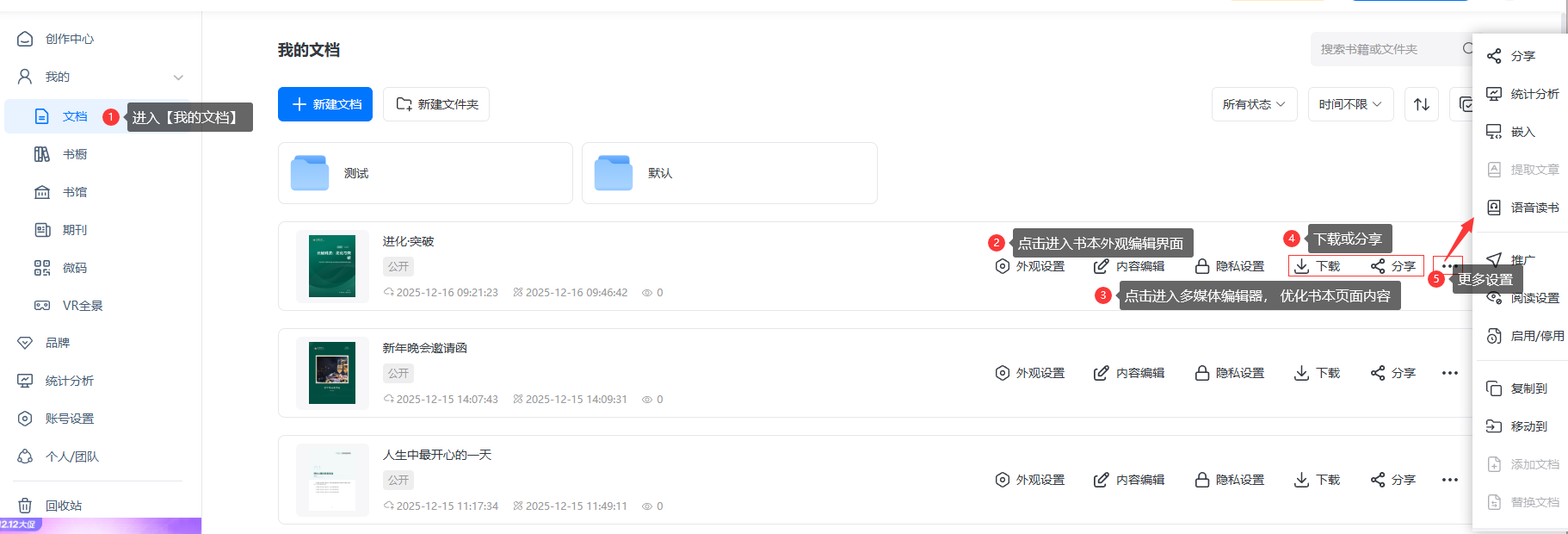 最終,書本將顯示在【我的文檔】中。 您可以進一步編輯優(yōu)化, 或進行其他操作, 如下載或分享。