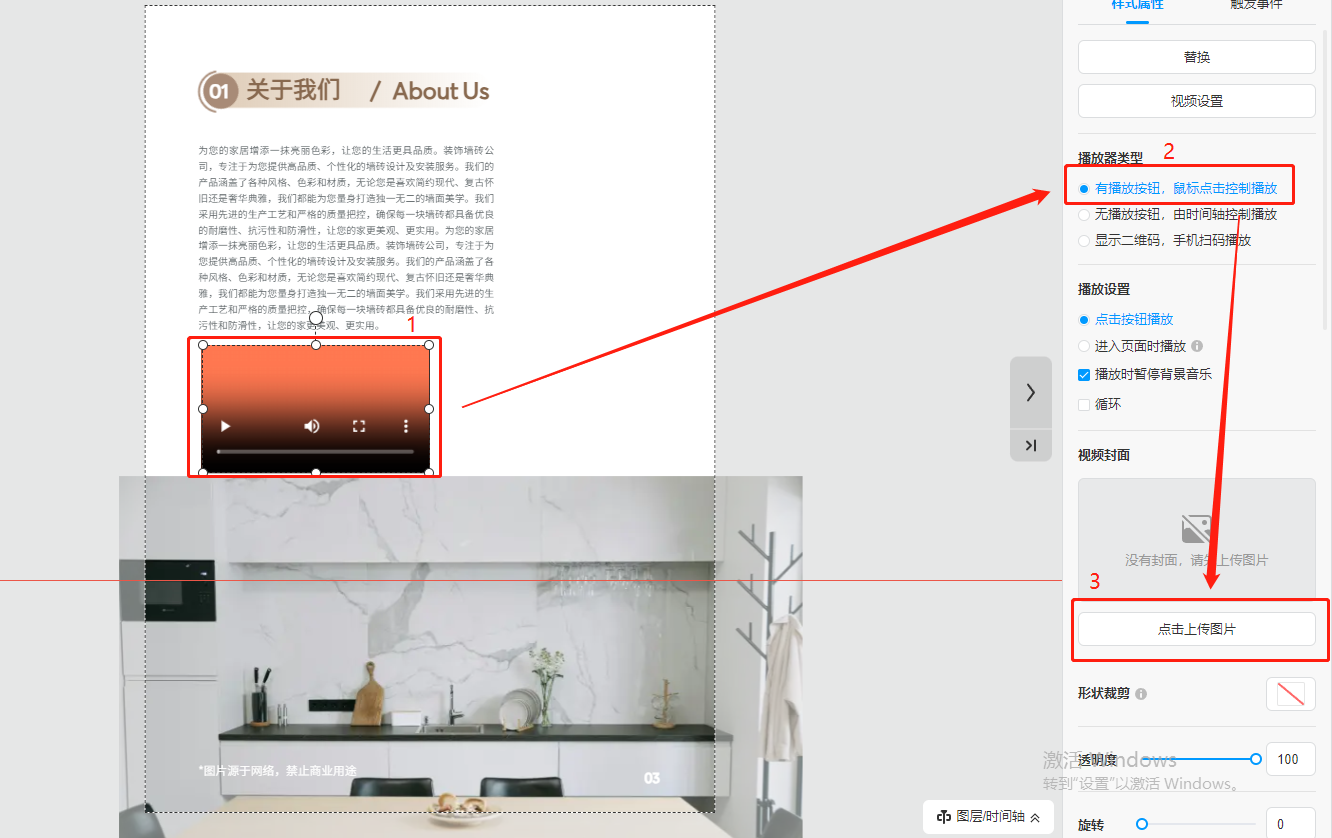 注意:只有視頻類型為【有播放按鈕,鼠標點擊控制播放】,才可設置視頻封面。