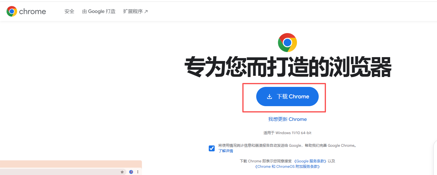 前往谷歌瀏覽器官網(wǎng),點擊【下載Chrome】下載,網(wǎng)站會自動檢測并下載安裝程序,下載好后安裝使用。