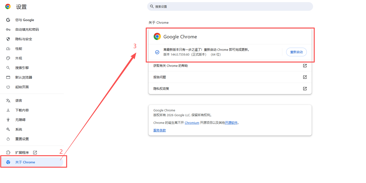 點擊右上角三個點圖標(biāo)?,點擊【設(shè)置】,在關(guān)于 Chrome頁面將自動加載,頂部顯示當(dāng)前版本號(如“版本 144.0.7559.60(正式版本) (64 位)”),若顯示“已是最新版本”或類似提示,表明當(dāng)前為最新版本。??若提示“重新啟動即可更新”或“有新版 Chrome 可用”,則需更新。