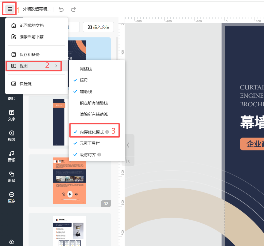 在編輯器里面,點擊左上角的三條杠按鈕,點擊【視圖】,勾選【內(nèi)存優(yōu)化模式】。