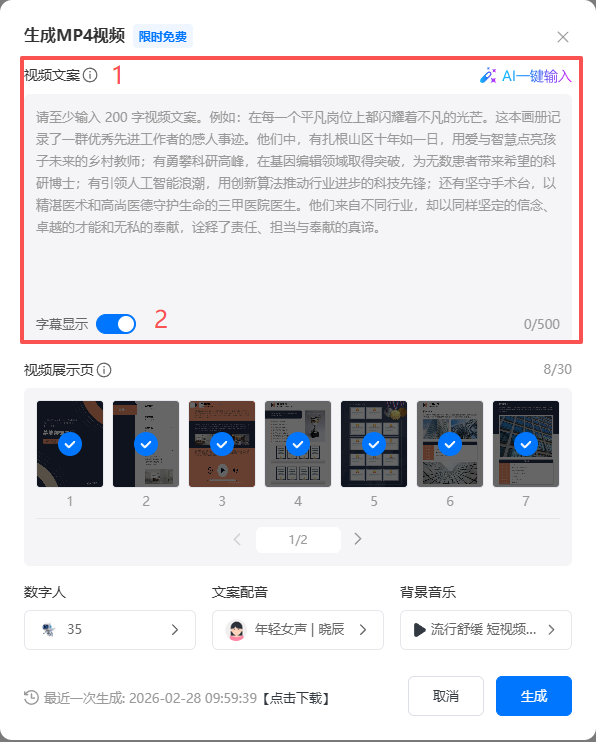 輸入至少200字的視頻文案,也可點(diǎn)擊【AI一鍵輸入】自動(dòng)生成文案,視頻文案輸入完成后,勾選是否顯示字幕。