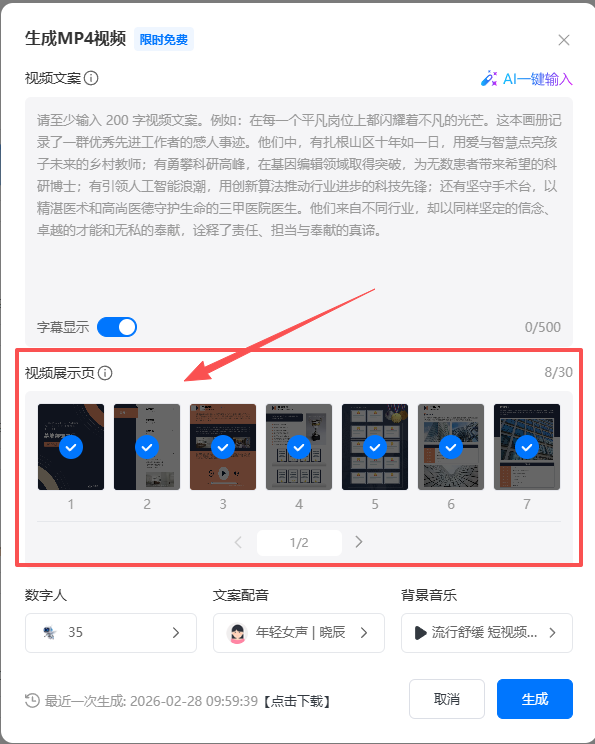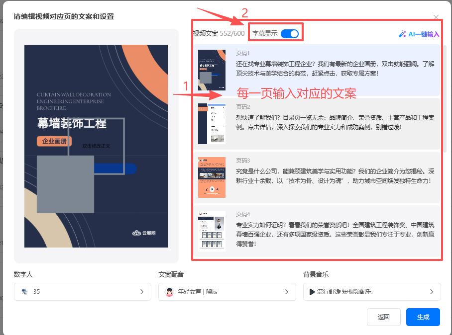 (2)輸入每一頁(yè)對(duì)應(yīng)的文案(文案總字?jǐn)?shù)不能超過(guò)600字),也可點(diǎn)擊【AI一鍵輸入】自動(dòng)生成文案,文案輸入完成后 ,勾選是否顯示字幕。