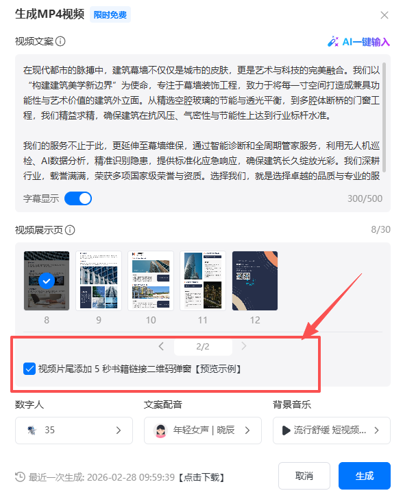 (3)勾選【視頻片尾添加 5 秒書(shū)籍鏈接二維碼彈窗】,在視頻片尾會(huì)彈出書(shū)籍二維碼,方便觀(guān)眾掃碼查閱電子書(shū),有助于提高電子書(shū)的訪(fǎng)問(wèn)量和加強(qiáng)電子書(shū)的宣傳和推廣。