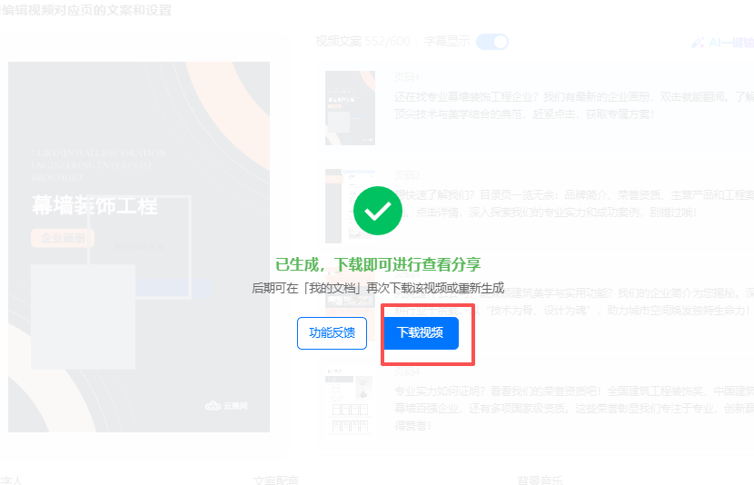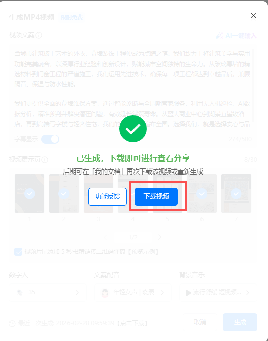 (5)待視頻生成完成后,點(diǎn)擊【下載視頻】保存。