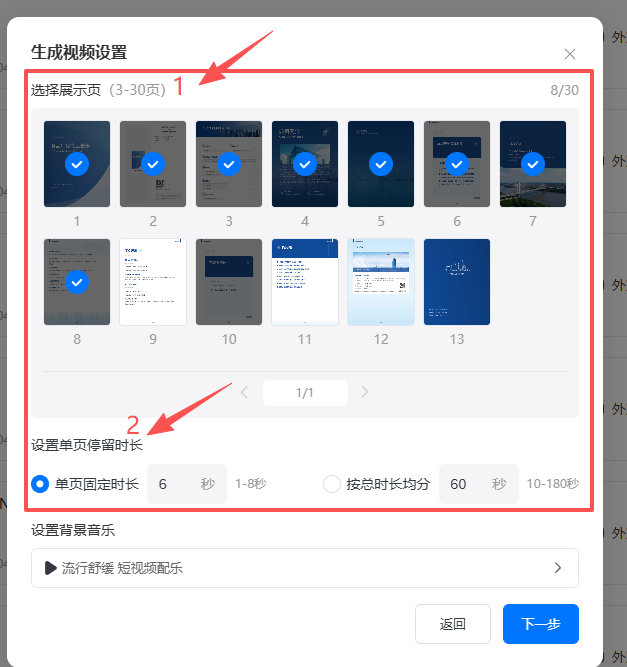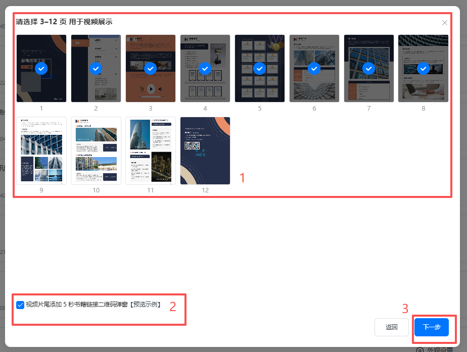 (1)選擇高級(jí)模式后,選擇需要在視頻展示的電子書(shū)頁(yè)面(選擇3到12頁(yè)),勾選【視頻片尾添加 5 秒書(shū)籍鏈接二維碼彈窗】,在視頻片尾會(huì)彈出書(shū)籍二維碼,方便觀(guān)眾掃碼查閱電子書(shū)。然后點(diǎn)擊【下一步】。