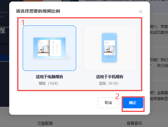 (4)選擇所需的視頻比例,可選取橫版或豎版尺寸進(jìn)行生成,隨后點(diǎn)擊【確定】。