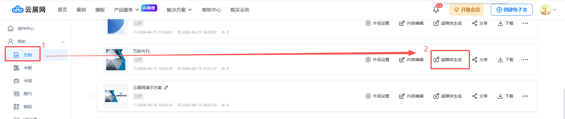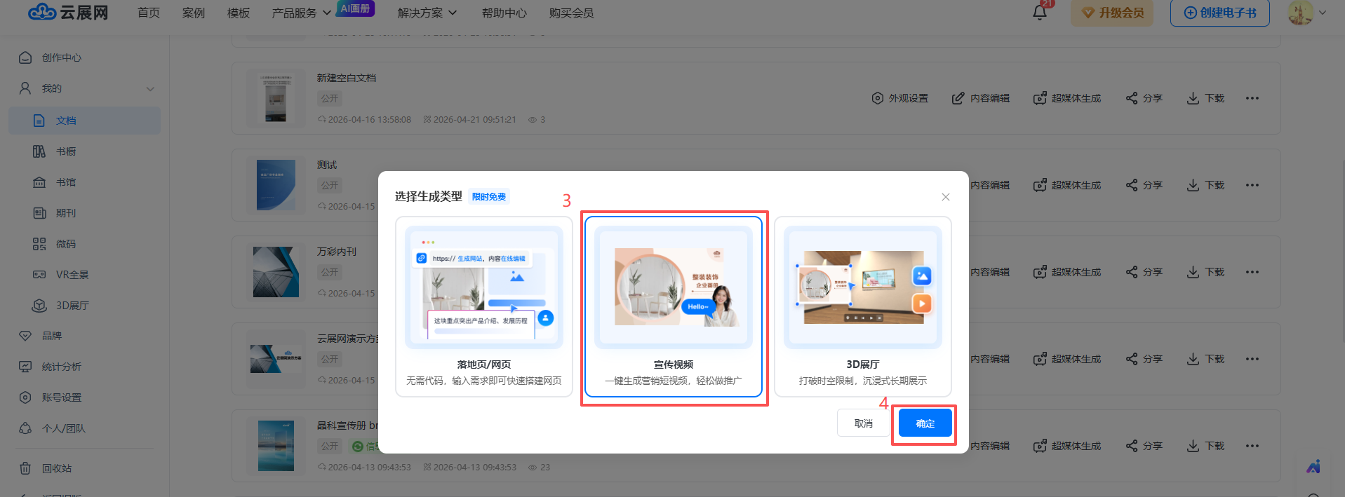 在【文檔】頁(yè)面,找到已制作好的電子書(shū),點(diǎn)擊【超媒體生成】,隨后點(diǎn)擊【宣傳視頻】,然后點(diǎn)擊【確定】。