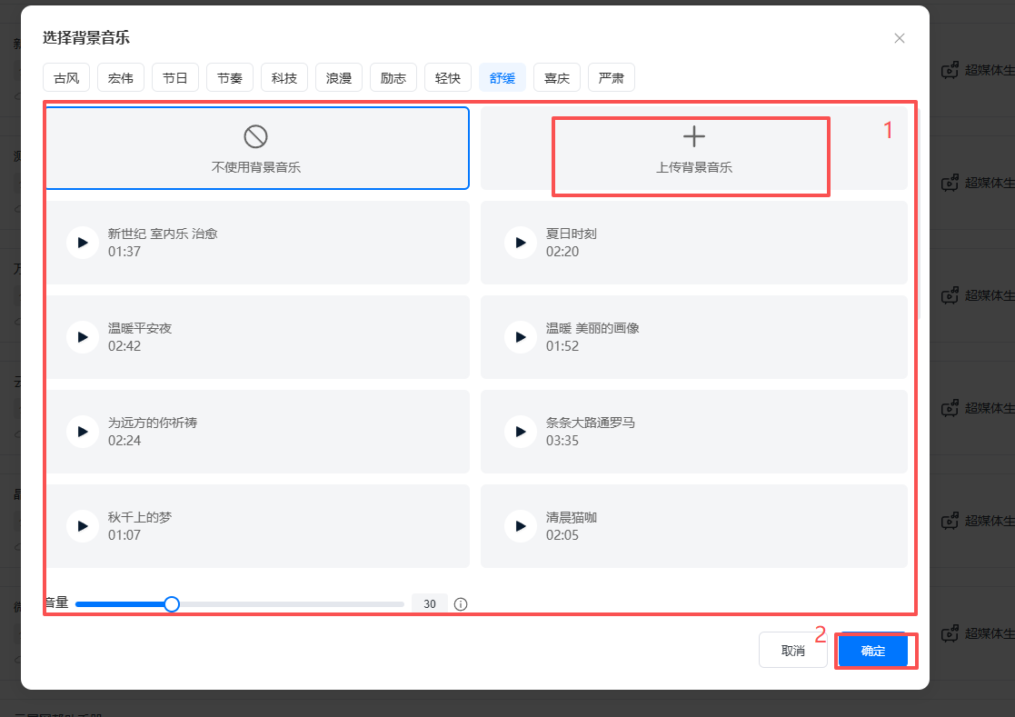 可選擇平臺(tái)上提供的背景音樂(lè),或自行上傳背景音樂(lè)文件,文件格式須為MP3。設(shè)置好后點(diǎn)擊【確定】。