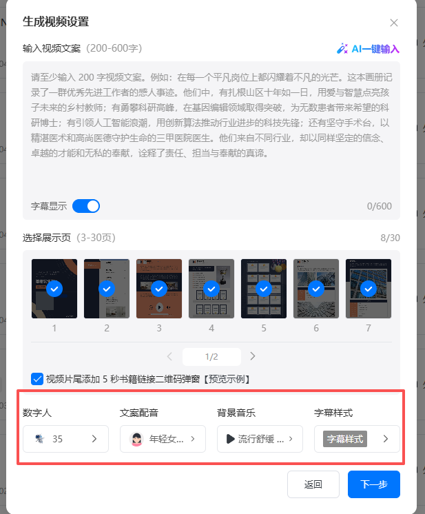 (4)設(shè)置數(shù)字人、文案配音、背景音樂(lè)、字幕樣式,設(shè)置完成后點(diǎn)擊【下一步】