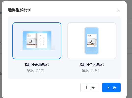 (3)選擇所需的視頻比例,可選取橫版或豎版尺寸進(jìn)行生成,隨后點(diǎn)擊【下一步】。
