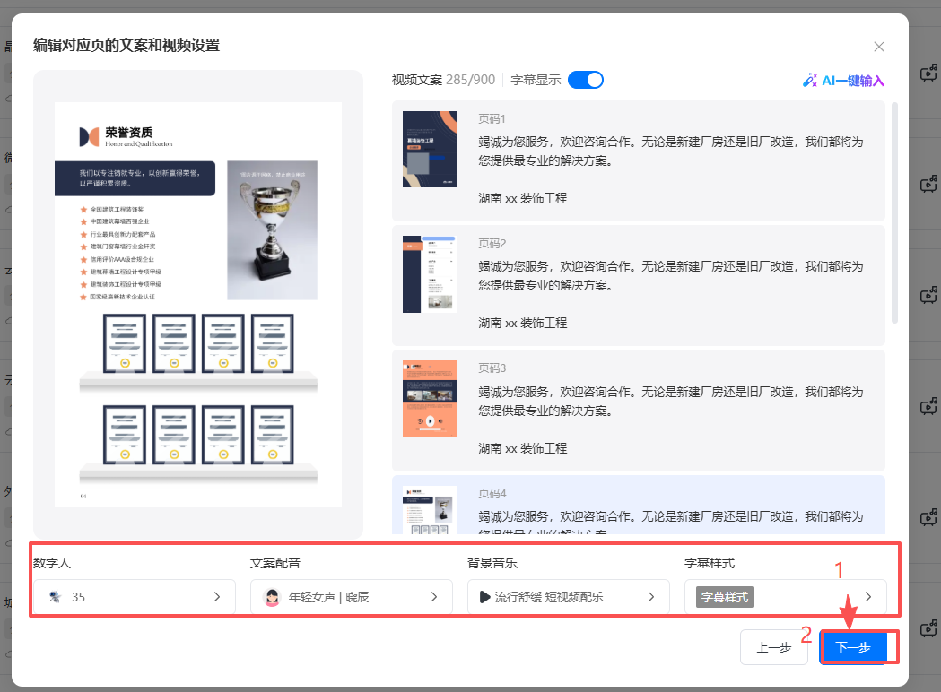 (3)設(shè)置數(shù)字人、文案配音、背景音樂(lè)、字幕樣式,設(shè)置好后點(diǎn)擊【下一步】。