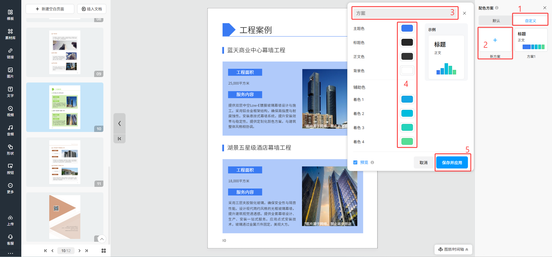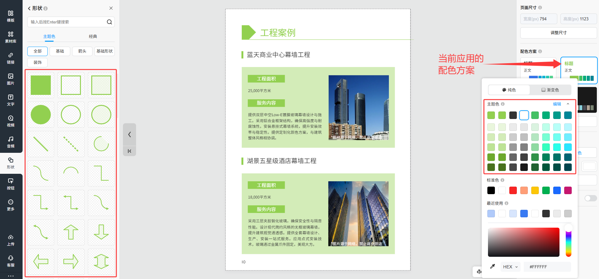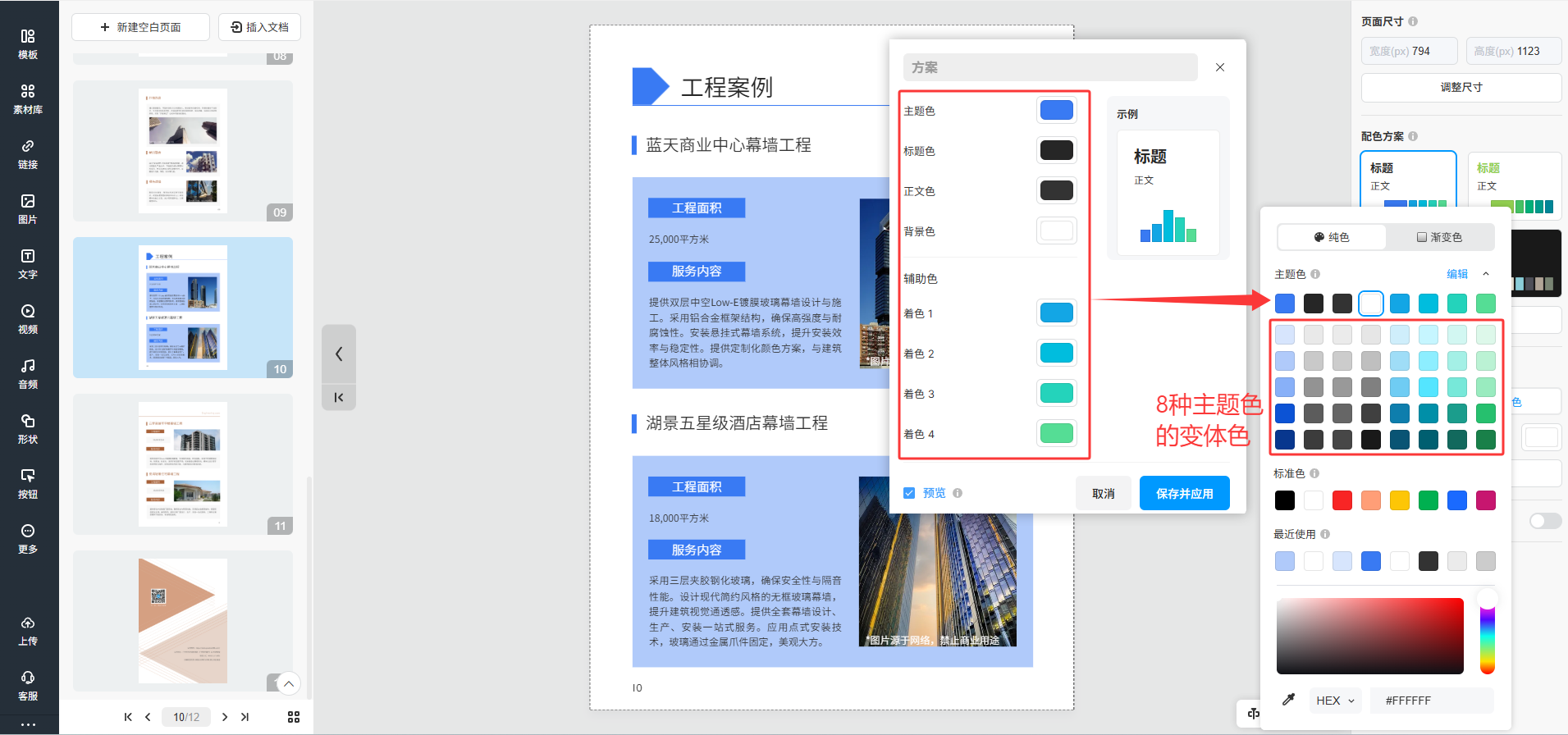 自定義漸變色時(shí),通過(guò)使用調(diào)色板【主題色】區(qū)域的顏色去調(diào)配漸變色,漸變效果會(huì)在切換配色方案時(shí)自動(dòng)更新顏色。