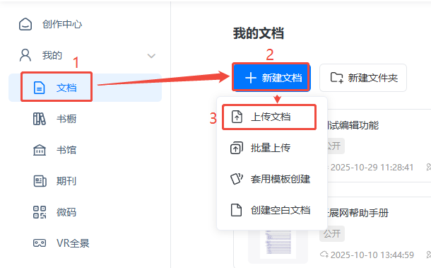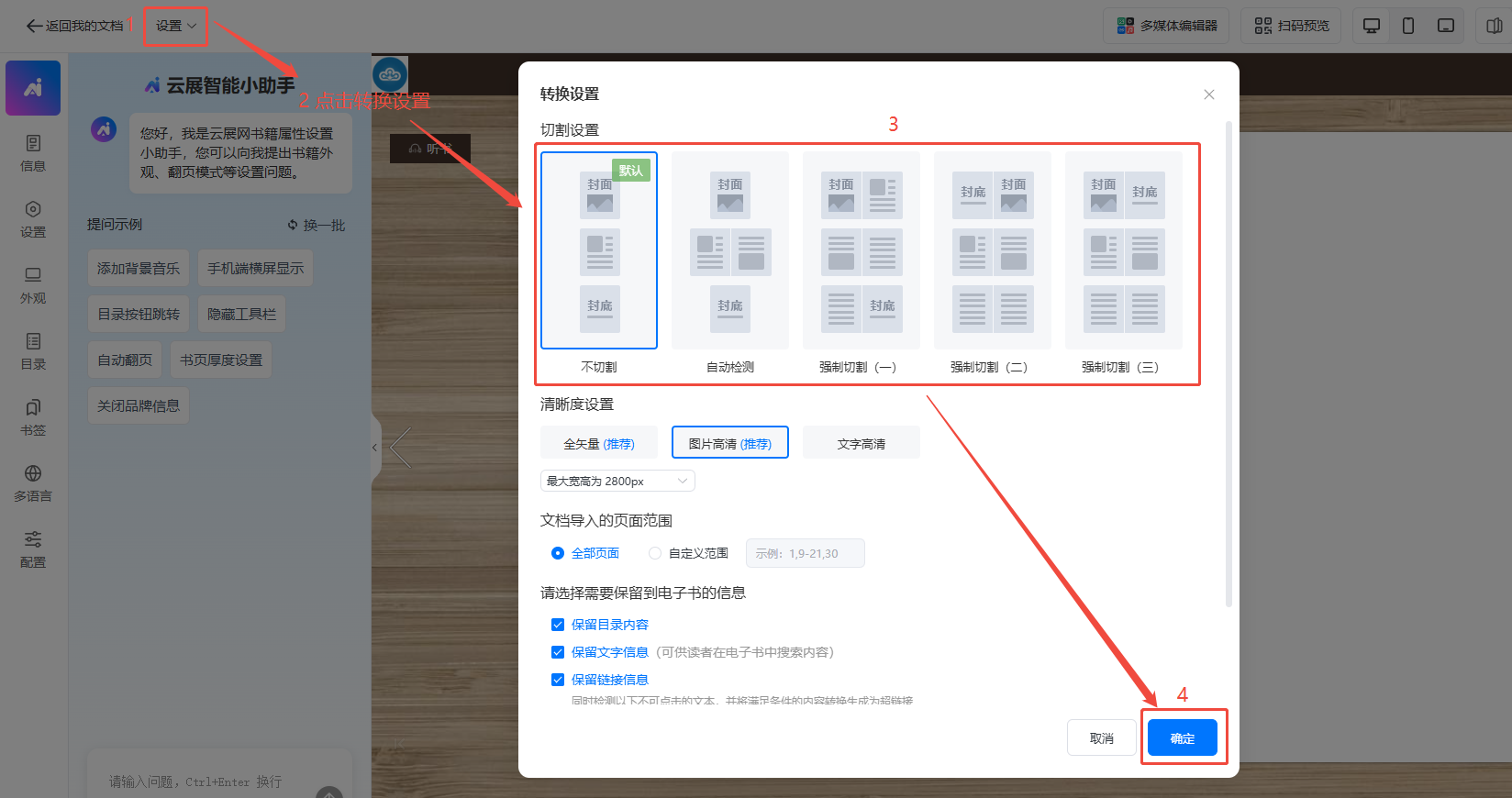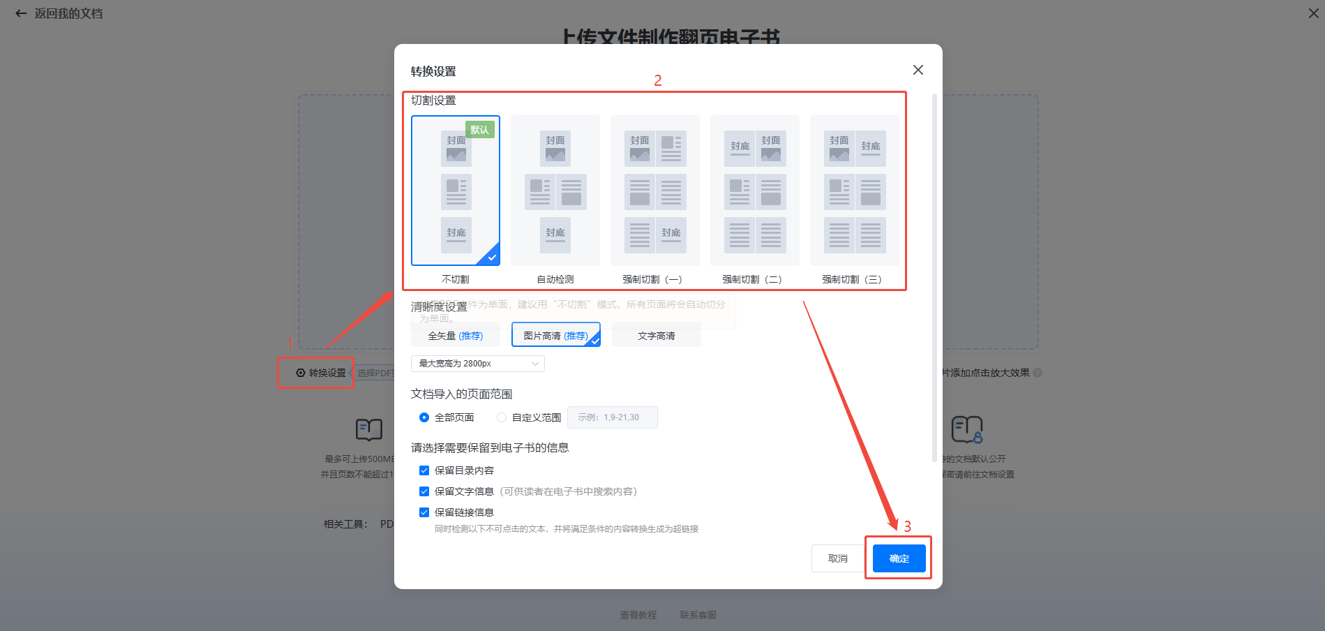 在【文檔】頁面,點擊【新建文檔】里面的【上傳文檔】,點擊【轉(zhuǎn)換設(shè)置】,選擇切割方式后點擊【確定】。
