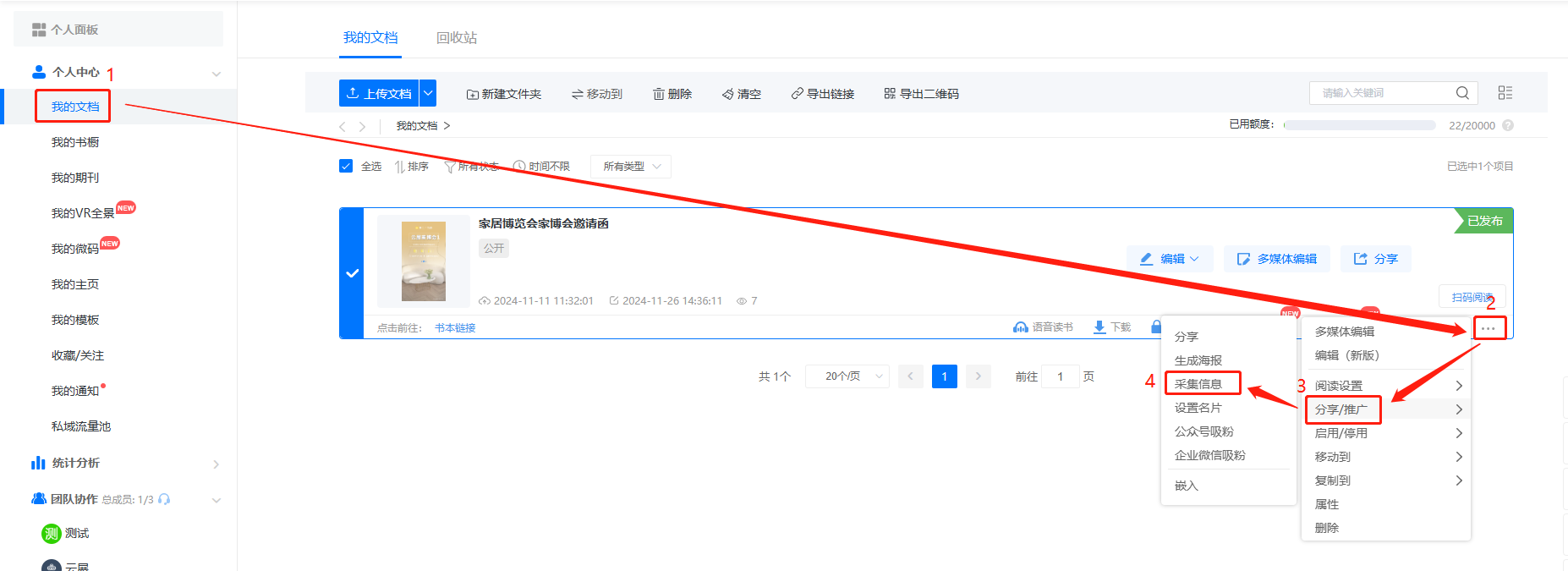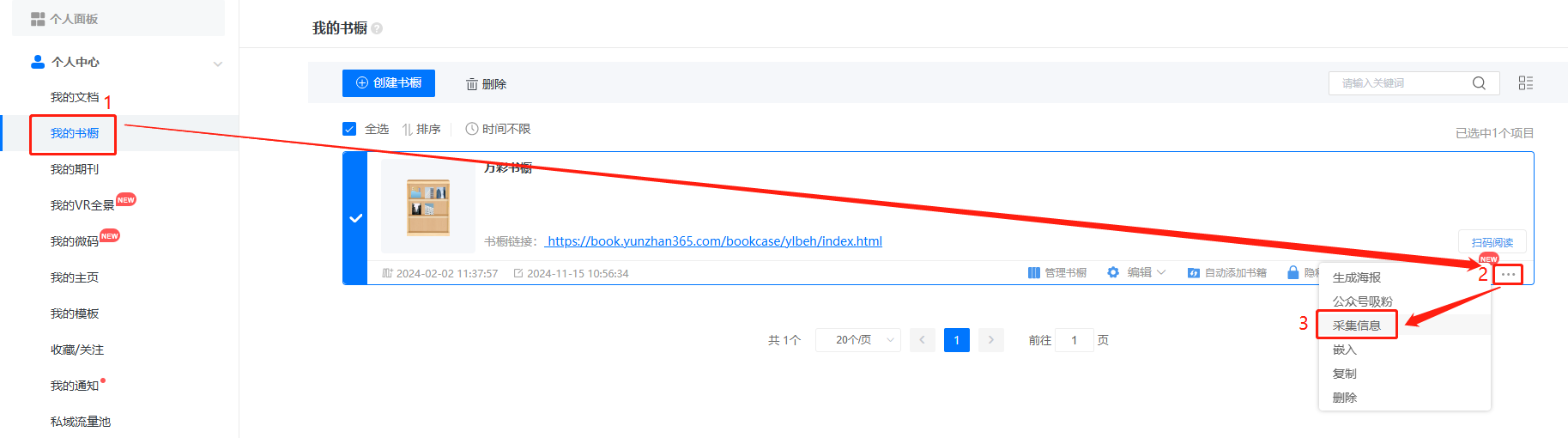 點(diǎn)擊【我的文檔】/【我的書櫥】,找到書本/書櫥,點(diǎn)擊右下角三個點(diǎn),點(diǎn)擊【采集信息】。