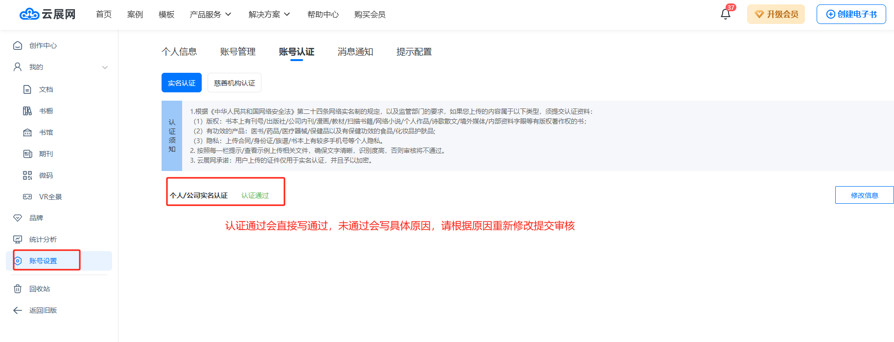 電腦登錄云展網(wǎng)網(wǎng)站,登錄您的賬號(hào),點(diǎn)擊【賬號(hào)設(shè)置】,點(diǎn)擊【賬號(hào)認(rèn)證】打開賬號(hào)認(rèn)證界面