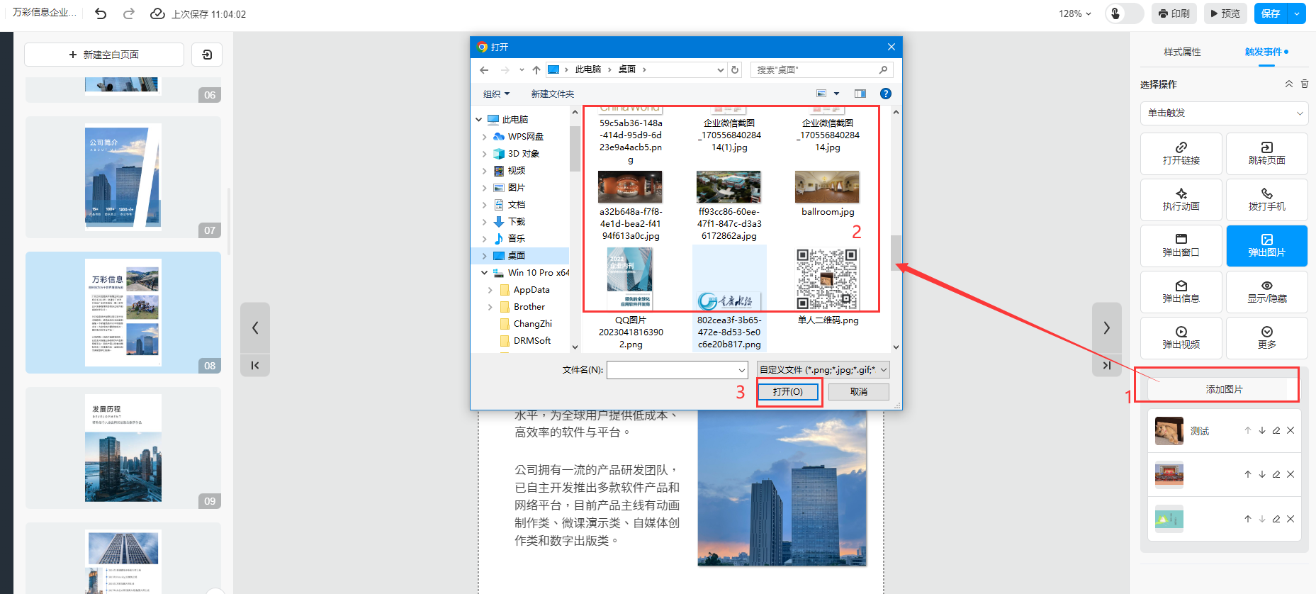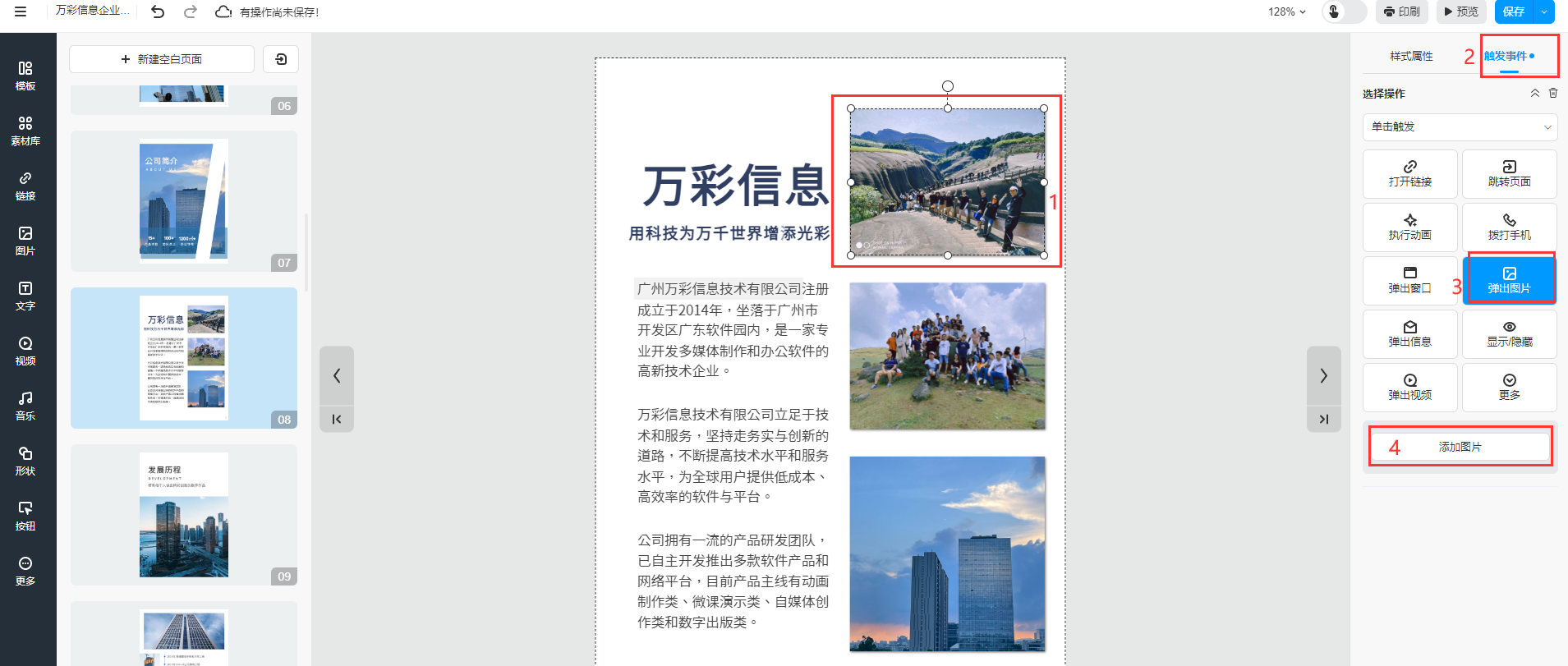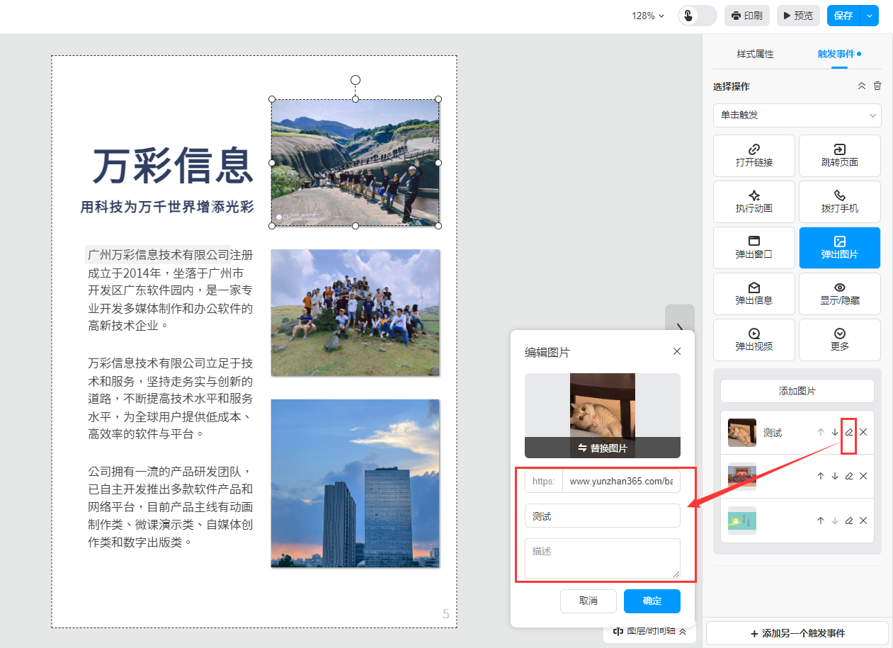 ①、選中需要彈出圖片的位置,可以是文字或者圖片,然后點(diǎn)擊【觸發(fā)事件】選擇【彈出圖片】