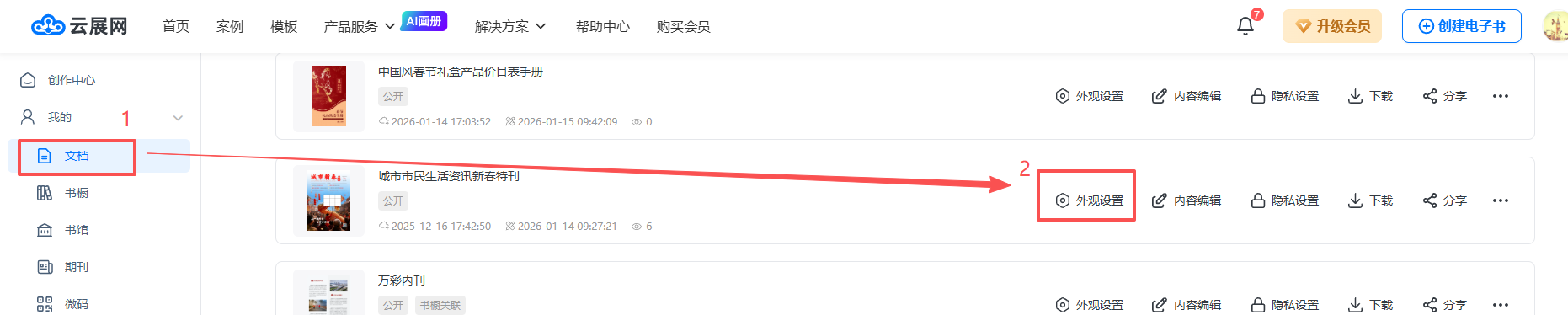 點擊【文檔】,找到需要設(shè)置的書本,然后點擊【外觀設(shè)置】,打開編輯界面。