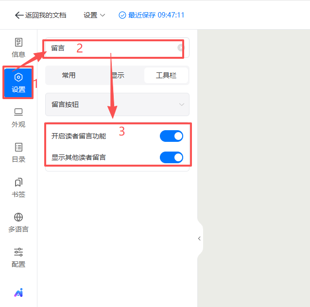點擊【設(shè)置】,搜索欄搜索【留言】,將【開啟讀者留言功能】和【顯示其他讀者留言】打開。